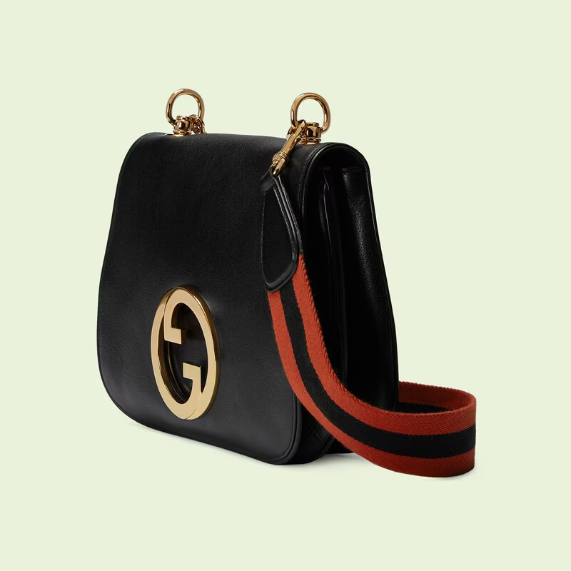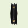 Coming from the House’s archives, a geometrically shaped version of the Interlocking G logo is reintroduced for Gucci Love Parade. The gold-toned hardware adds a defined vintage feel to the style, enriching the design with a timeless feel—mirroring the Hollywood glamour that shaped the fashion show. The black leather bag is completed by two interchangeable shoulder straps, in tonal leather or the Web stripe.