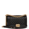 This Old Medium Boy bag is in black caviar leather with antique gold tone hardware and features a full front flap with the Le Boy CC push lock closure and an antique gold tone chain link and black leather padded shoulder/crossbody strap.