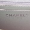 The interior is lined in purple iridescent leather and features a zipper pocket with Chanel pull and an open pocket below.