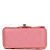 This Mini Square flap bag is in pink iridescent lambskin with silver tone hardware and has a front flap with signature CC turnlock closure, rear half moon pocket and single interwoven pink leather and silver tone chain link shoulder/crossbody strap.