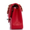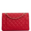 This Small Classic Double Flap bag is in?red caviar leather with light gold tone hardware and features a front flap with signature CC turnlock closure, half moon back pocket, and adjustable interwoven light gold tone chain link and?red leather shoulder strap.