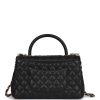 This Small REPLICATECOPY Handle Flap bag is of black caviar with light gold tone hardware and has the signature diamond quilting in a trapezoidal shape with signature CC interlocking closure, top handle, and long light gold tone and black leather chain.