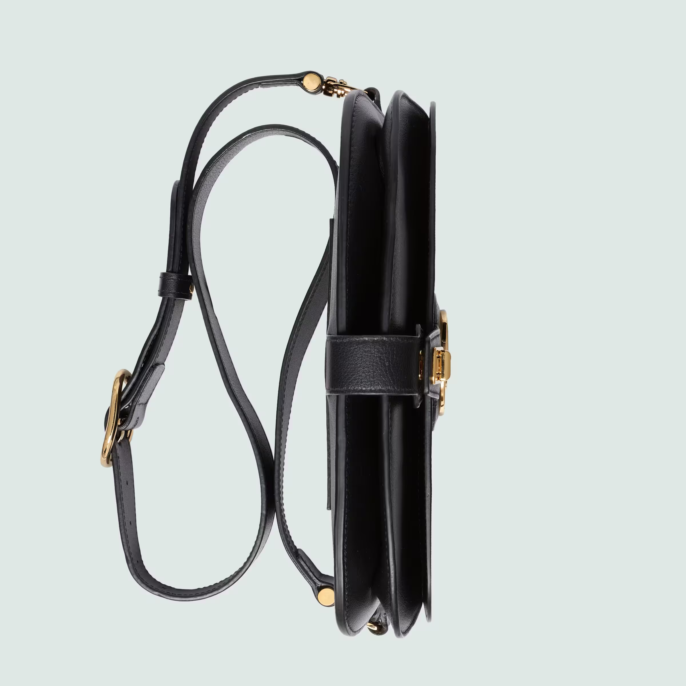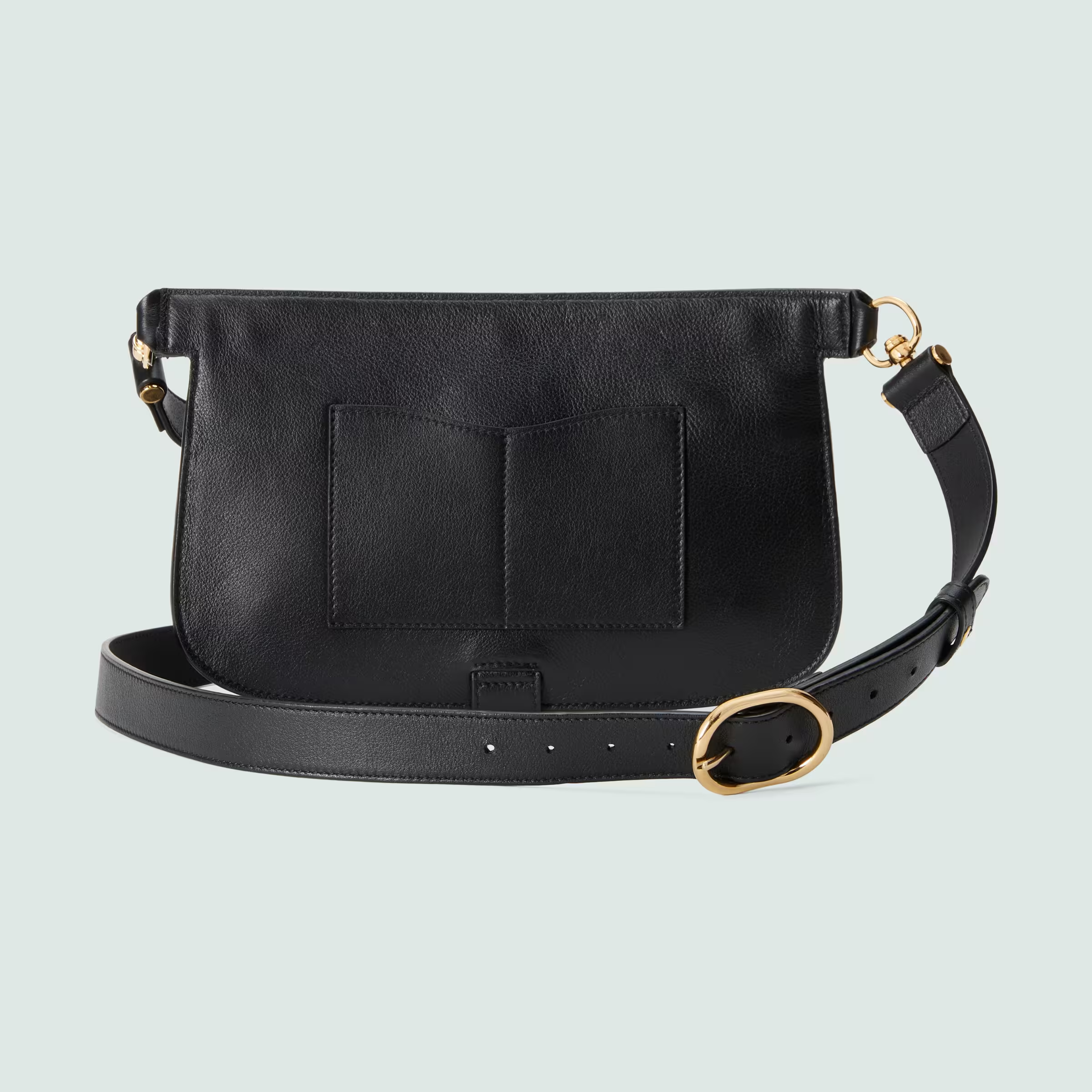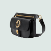 The Blondie hardware, a geometrically shaped version of the Interlocking G logo, continues as part of Exquisite Gucci. The gold-toned buckle adds a refined vintage feel to this new belt bag style in black leather, while the zip compartment reflects a modern versatility.