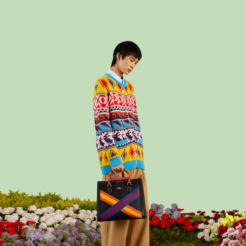 In celebration of a new year, as well as the arrival of Spring, the House presents a wide-ranging selection of colourful leather accessories featuring various combinations of materials alongside the Gucci logo. The Web stripe appears in vibrant new colourways in a contemporary revival of an archival detail. This Gucci Diana tote bag is defined by a criss-cross Web stripe.