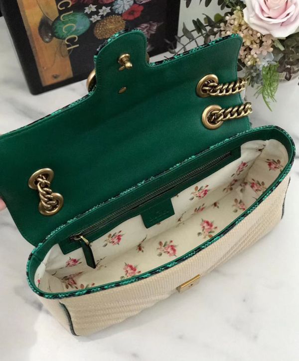 Gucci GG Marmont Beige Raffia Women Small Flap Bag Antique Golden Hardware 2022 Cheapest Green Snakeskin Trimming Chain Bag