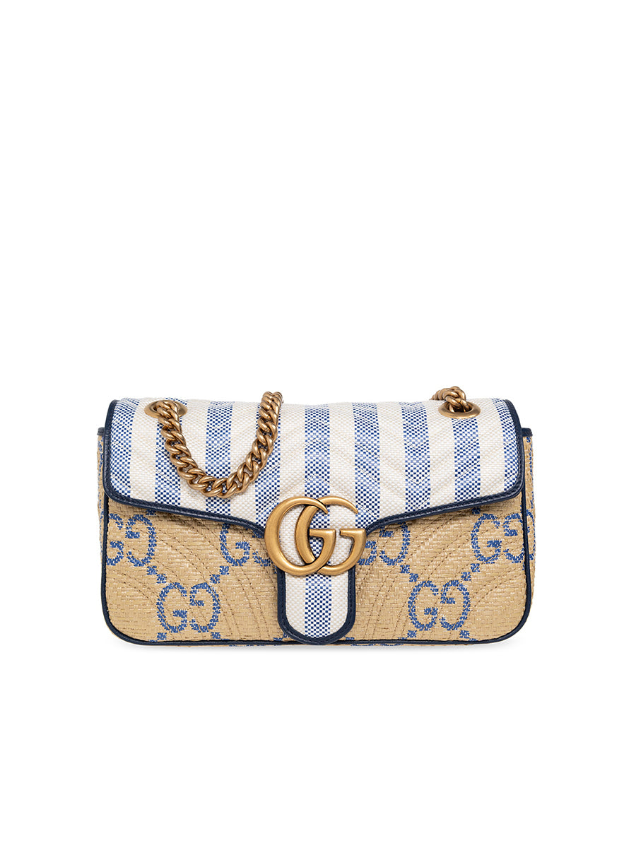 Home Bag Gucci Bag Gucci Best Sellers Gucci GG Marmont Matelasse Shoulder Bag in Beige and Blue Raffia Effect