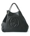 | Exterior | Dark black calfskin leather exterior with top sides turning in to attach in the center to a hook clasp closure,a large heat embossed Gucci logo in front highlighted with stitch embroidery,two flat leather arm-carry straps attached to tiny brass buckles and a leather tassle suspended from one of the strap buckles |