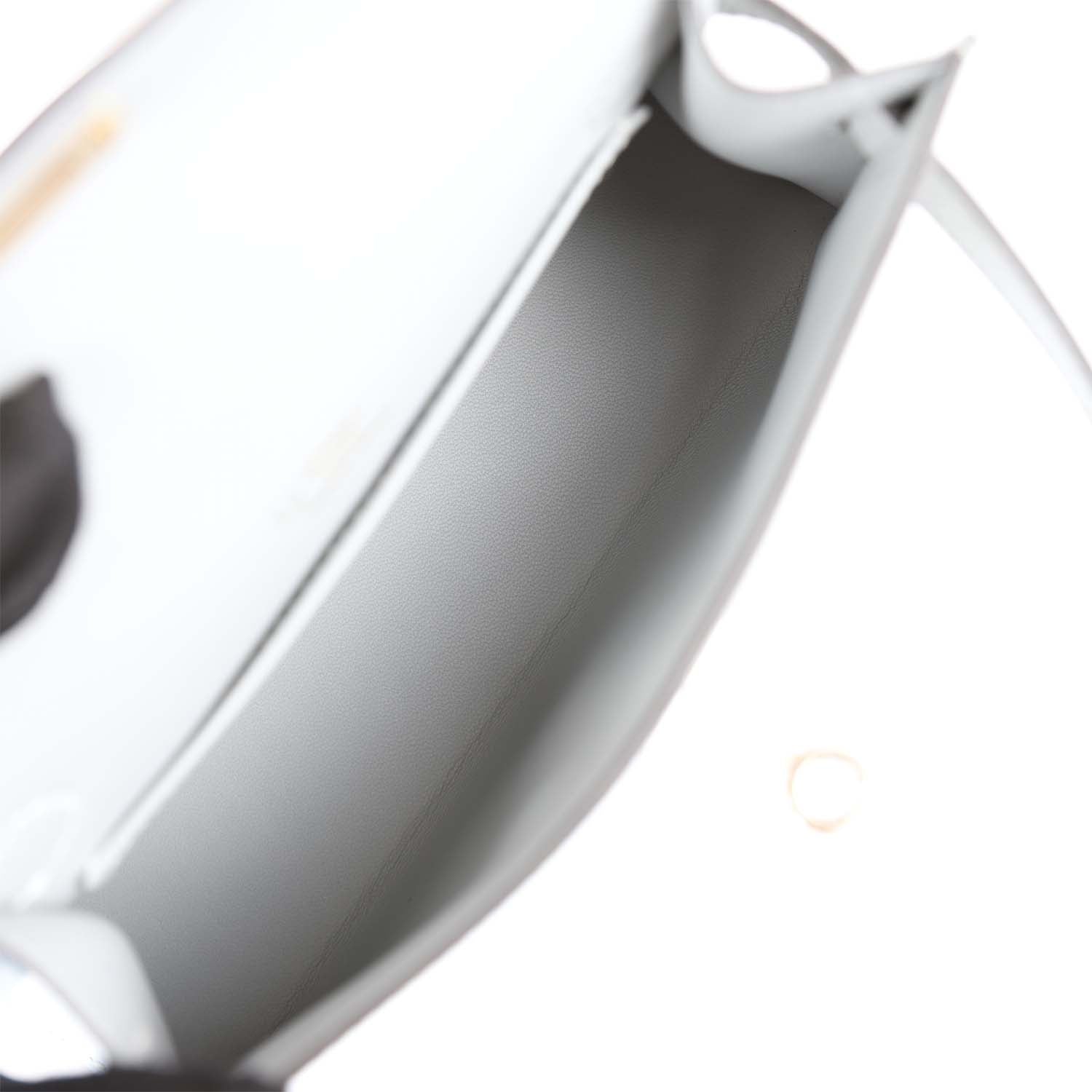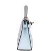 This tiny Horseshoe Stamp Casaque Kelly, in the Sellier style, is in Bleu Brume and Gris Meyer epsom leather with permabrass hardware and has contrast stitching, two front straps with front toggle closure, single rolled handle and removable shoulder strap.
