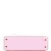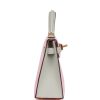 This tiny Horseshoe Stamp Kelly, in the Sellier style, is in Rose Sakura and Gris Perle chevre leather with gold hardware and has tonal stitching, two front straps with front toggle closure, single rolled handle and removable shoulder strap.