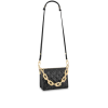 The Coussin BB has the softest cushion-like texture. The Coussin BB is made of puffed lamb leather embossed with a Monogram pattern in a lovely compact size. The chunky gold-colored chain and slender leather strap are both detachable