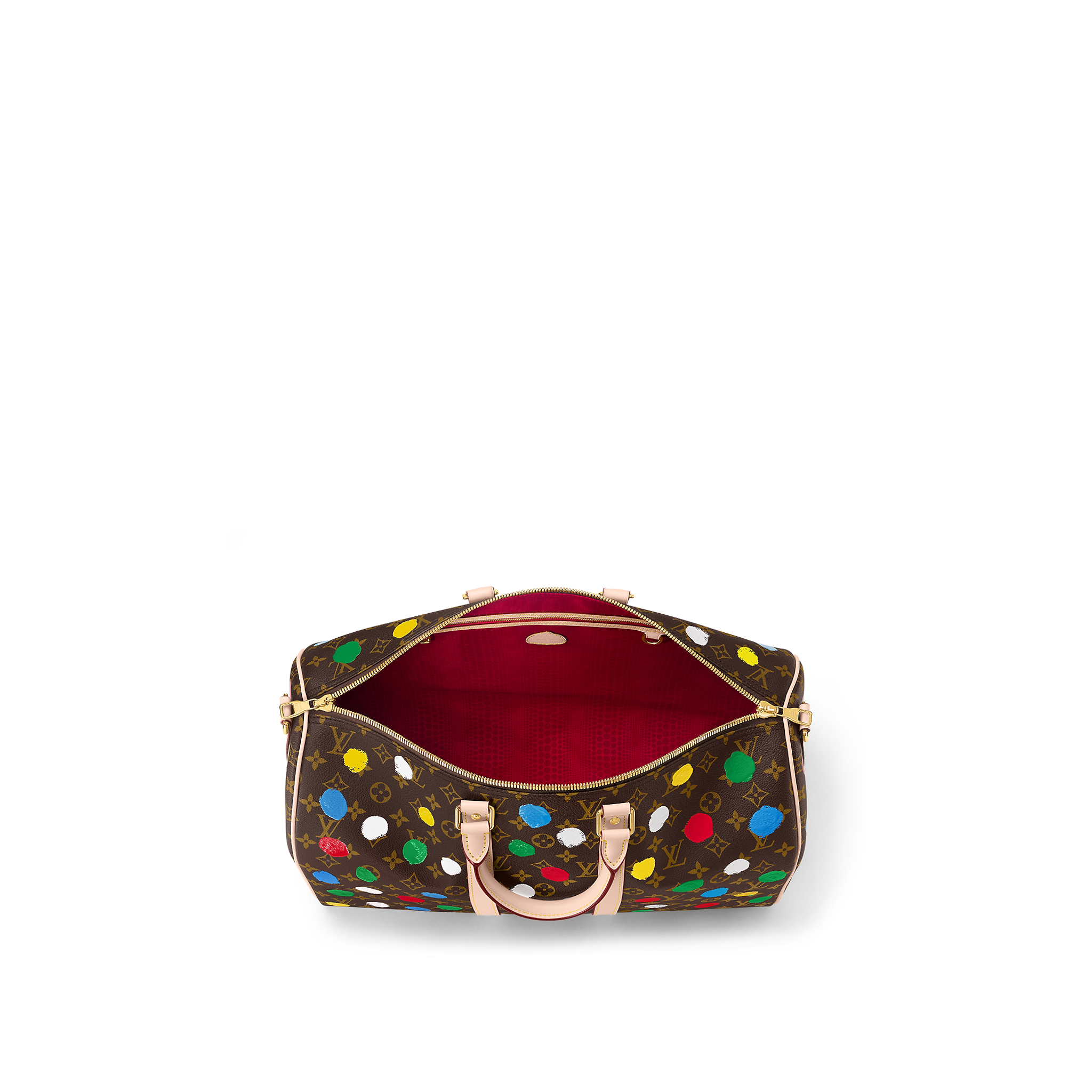 This iconic travel bag joins the Louis Vuitton x Yayoi Kusama collection with a vibrant new print. The celebrated Japanese artist is known for her signature use of dotted patterns, a symbol of her visions and obsessions. For the LVxYK Keepall 45, her colorful hand-painted dots are painstakingly reproduced on Monogram canvas with a striking 3D effect. An upbeat look for a practical bag.