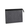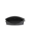 The Pochette Voyage in Damier Graphite canvas is a smart, structured pouch that can be used for a variety of purposes. It can be carried in the hand for a stylish look, or slipped inside a larger bag when traveling. It is large enough to hold a laptop and contains a pocket and credit card slots.