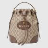 A drawstring backpack with a bucket shape made in soft GG Supreme, crafted from a coated microfiber fabric. The back shoulder straps come with a mechanism that allows them to be released and adjusted to be worn as a shoulder strap. The contrast handle pays homage to the House’s past, when artisans would repair luggage by replacing worn handles with new ones in any colors that were available.