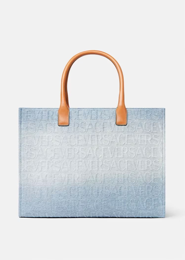 This washed, denim canvas tote bag is adorned with a central La Medusa plaque and a raised Versace Allover tonal logo. The rigid top handles are crafted from leather, and the spacious interior has a zipped pocket and a protector strap.