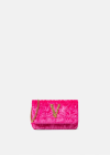 Crafted from soft textured, velvet with a quilted V-pattern, the Virtus mini bag features a Barocco V with engraved acanthus leaf detailing and a magnetic flap closure. The small evening bag is complete with a shoulder chain strap and internal card slots.
